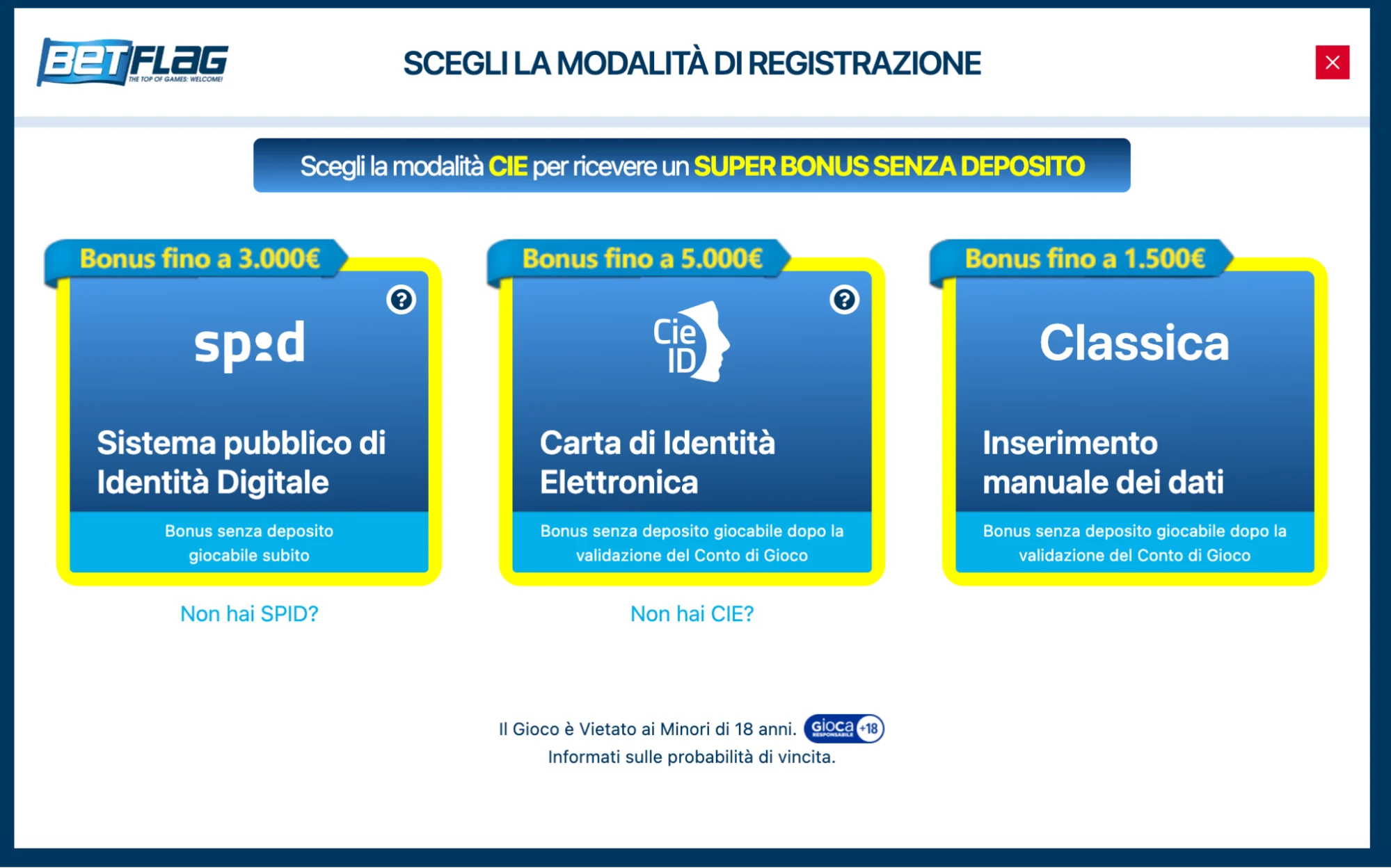 Per iniziare a giocare su BetFlag, è indispensabile aprire un conto gioco cliccando sul pulsante “Registrati” e procedendo con le istruzioni a schermo. L’operatore offre tre modalità per completare l’iscrizione: puoi utilizzare SPID, CIE oppure puoi inserire manualmente i tuoi dati personali e caricare il tuo documento d’identità. Nei prossimi paragrafi vedremo nel dettaglio come funziona ciascuna opzione.