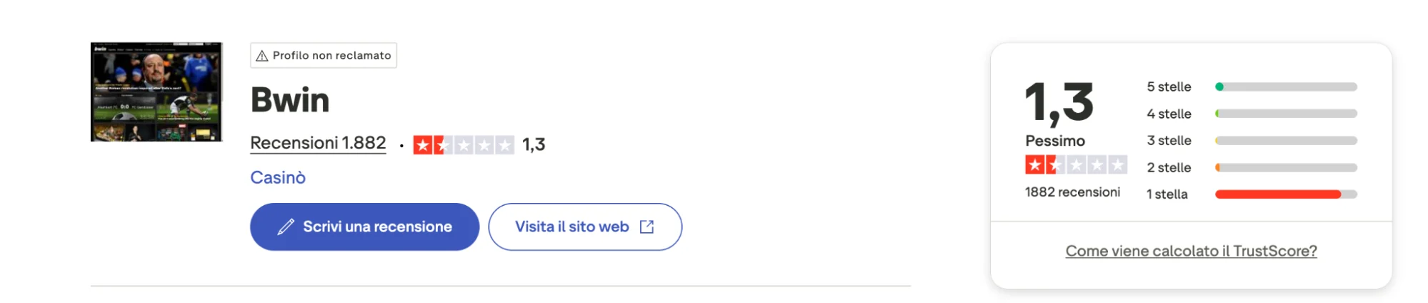 Nonostante si riconosca la sicurezza e l’affidabilità di bwin come operatore, su Trustpilot emergono diverse critiche da parte degli utenti. Alcuni segnalano ritardi nei pagamenti, rallentamenti del sito e un’assistenza non sempre efficace. Vengono inoltre citati limiti alle puntate e procedure di rimborso giudicate troppo macchinose.