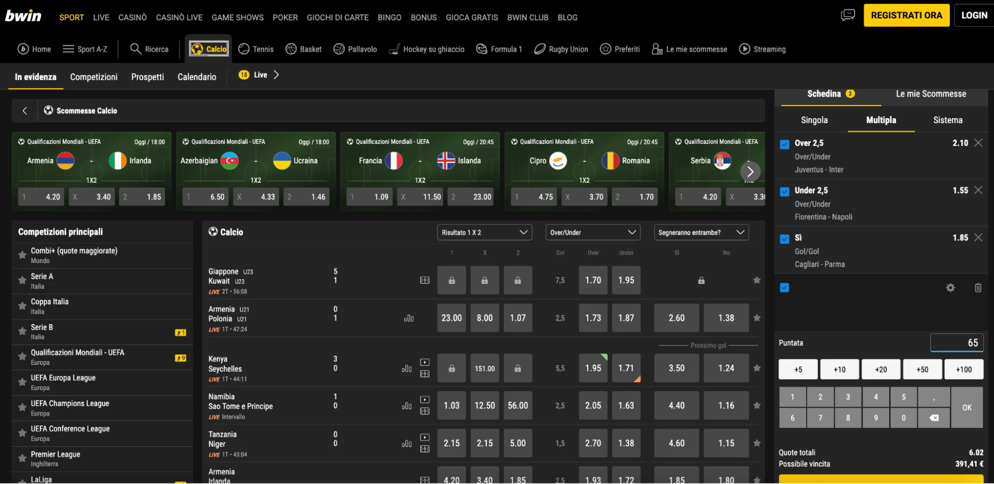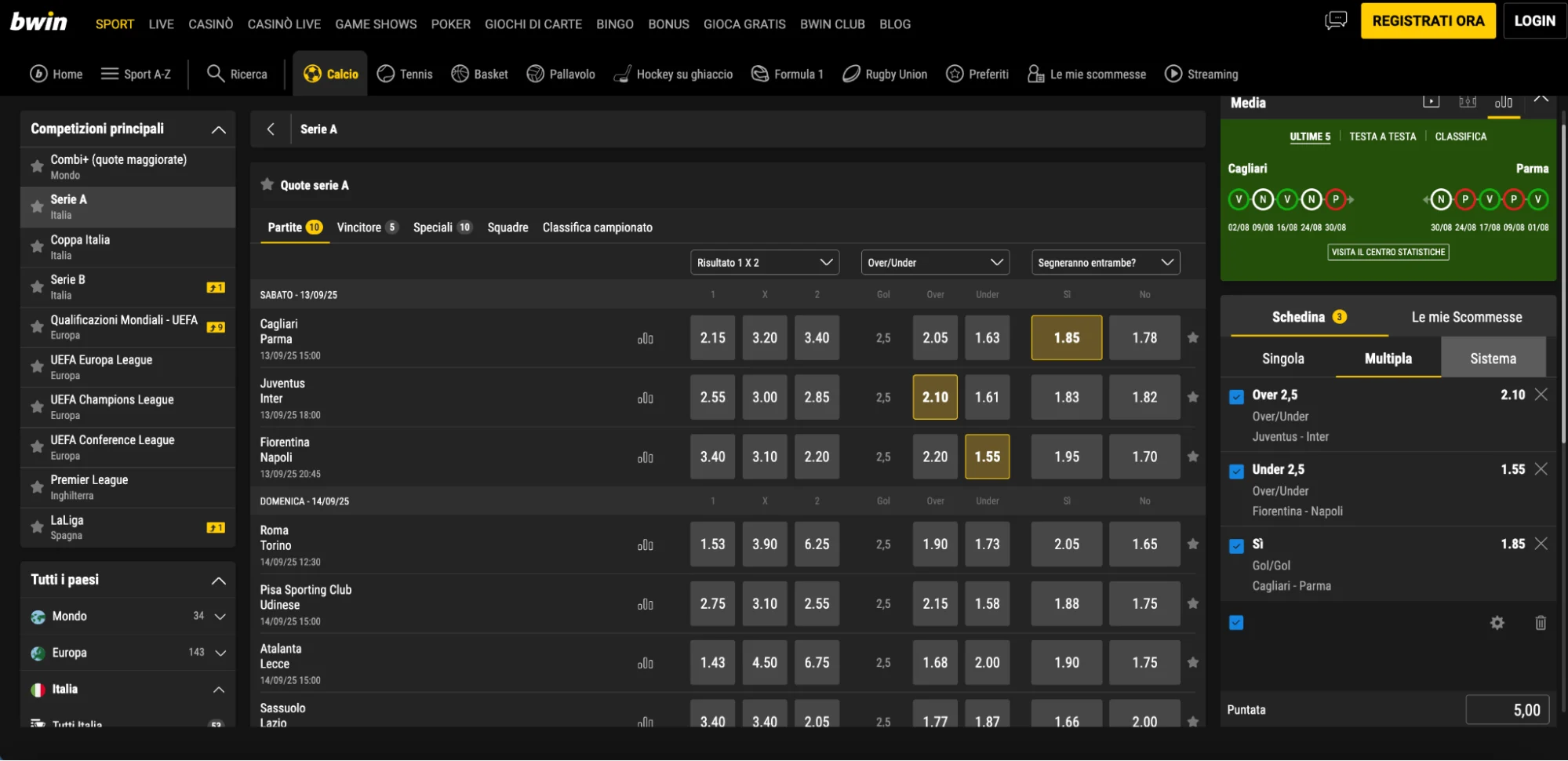 Con bwin puoi puntare in modalità singola, multipla o sistema. Scegliendo la partita che ti interessa e cliccando sulla quota, la selezione viene automaticamente aggiunta alla schedina visibile nella barra laterale destra.