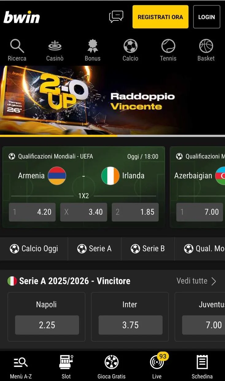 Nella parte centrale sono visualizzati gli eventi del giorno, gli highlights live e i tornei più seguiti, con particolare spazio al calcio. Se non vuoi o non puoi scaricare l’app, puoi comunque accedere a bwin da browser mobile, una versione che garantisce in ogni caso un’esperienza utente ottimale.