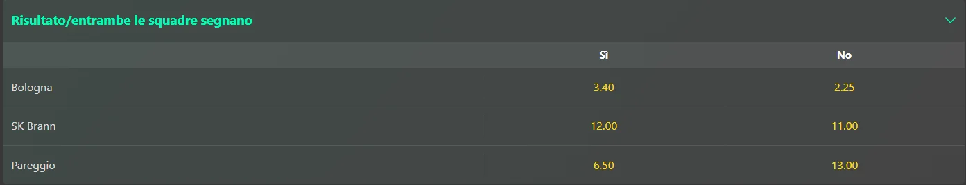 Se il risultato finale è Bologna-Brann 2-1, la scommessa è vincente perché entrambe hanno segnato e hai previsto la vittoria degli emiliani.