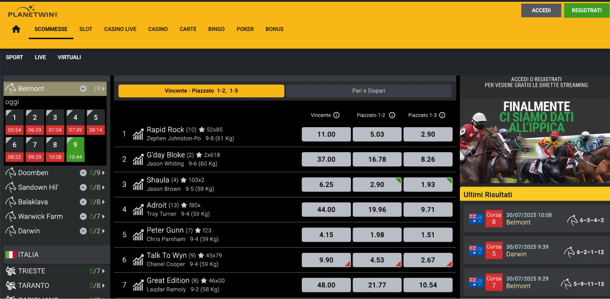 Il catalogo sportivo include anche l’ippica, con corse di trotto e galoppo da tutto il mondo, in linea con la vocazione originaria del bookmaker, nato appunto come operatore di betting con agenzie fisiche. A completare il palinsesto ci sono le scommesse virtuali e quelle speciali su spettacoli ed eventi politici.