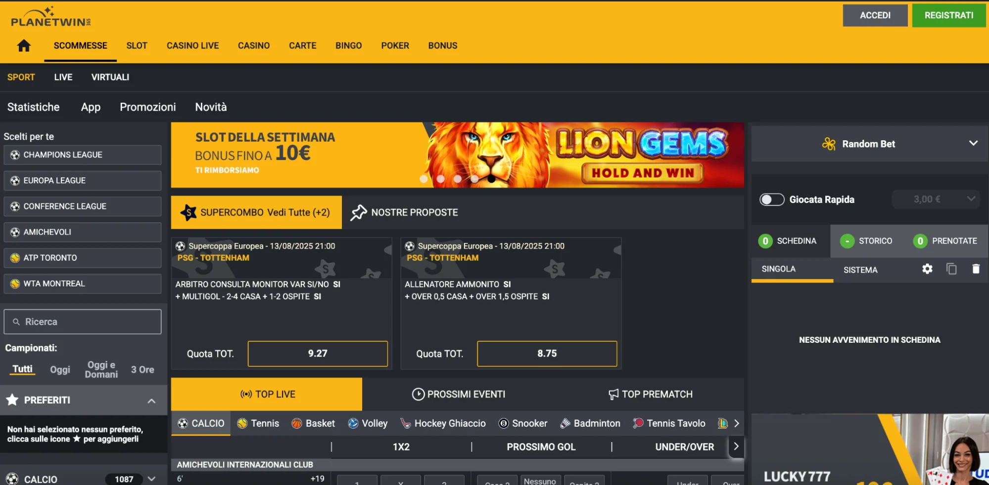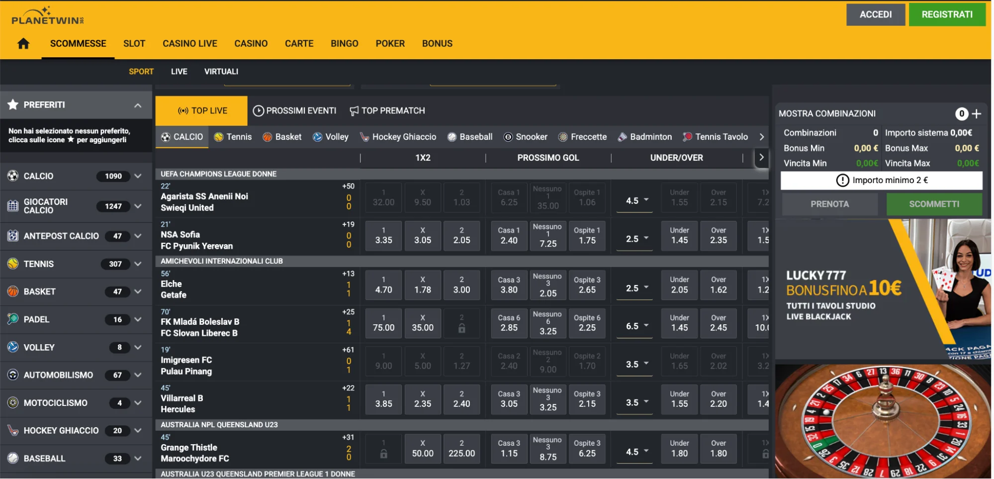 Per quanto riguarda l’offerta sportiva, Planetwin365 propone ben 25 discipline diverse. I mercati disponibili, soprattutto sulla Serie A, Champions League, quindi tennis e basket – sono tra i più completi del panorama italiano, con payout competitivi. Oltre alle classiche scommesse antepost e prematch, puoi trovare opzioni come under/over, combo, doppia chance, handicap asiatico, risultato esatto e molti altri mercati.