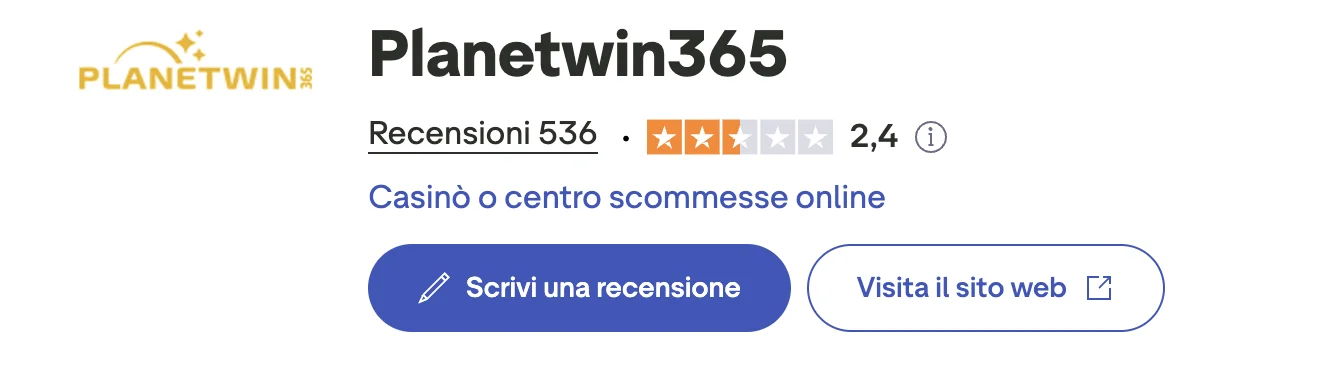Sui siti specializzati in betting, le recensioni degli utenti su Planetwin365 sono generalmente positive. La piattaforma incontra il favore degli scommettitori per la varietà dei campionati e dei mercati, nonché per le quote interessanti. Le recensioni su Trustpilot non sono del tutto positive, con una media di 2,4 stelle su 5 per 536 recensioni nel momento in cui scriviamo. Molti utenti lamentano un sito poco reattivo dopo gli aggiornamenti e difficoltà nel ricevere supporto dal servizio clienti.
