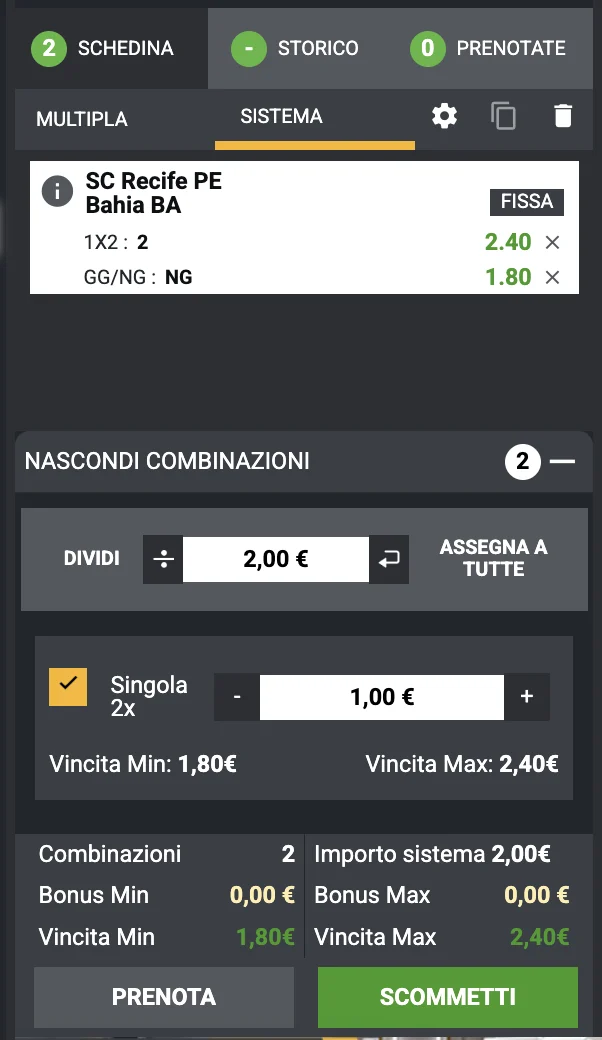 A questo punto, scegli la modalità di scommessa — singola, multipla o sistema — e inserisci l’importo che desideri puntare, eventualmente suddividendolo tra le diverse opzioni se hai selezionato più eventi. Conferma poi cliccando sul tasto “Prenota” oppure direttamente su “Scommetti”. Ricorda che, secondo normativa, sebbene non ci siano massimali di puntata, la vincita non può superare i 50.000€, mentre la puntata minima è di 1€.