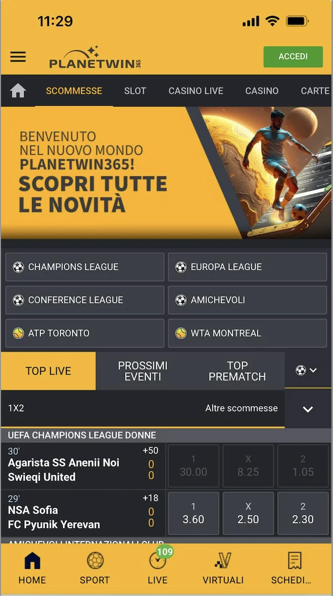 L’app di Planetwin365 per dispositivi iOS e Android offre gli stessi eventi e funzionalità della versione desktop. Il classico menù ad hamburger consente di accedere facilmente agli eventi e ai mercati di proprio interesse, mentre la selezione delle quote e la composizione della schedina risultano intuitive e veloci. Ottima anche la sezione live, con la possibilità di vedere su mobile i match in streaming in HD.