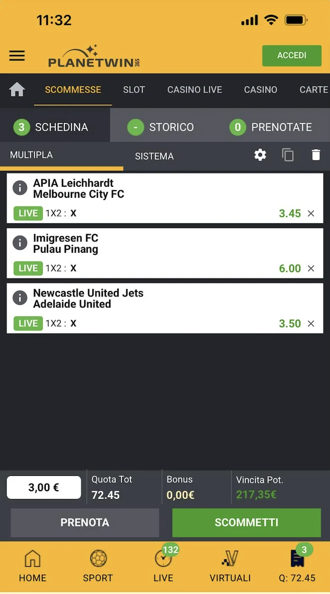 Planetwin365 offre tre tipologie di scommesse: singole, multiple e sistemi. Per queste ultime, il bookmaker permette di inserire fino a 30 eventi. Piazzare una scommessa è molto semplice: ti basta selezionare l’evento, la partita, il mercato e la quota di tuo interesse. La schedina si caricherà automaticamente nella parte destra dello schermo.
