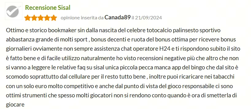 Qui, ad esempio, l’utente Canada89 è pienamente soddisfatto del palinsesto sportivo e degli strumenti messi a disposizione da Sisal per il Gioco responsabile.