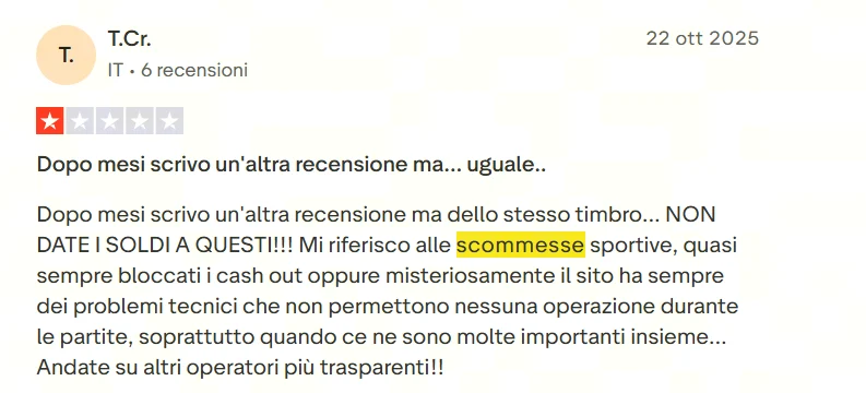 In un altro caso, invece, questo utente lamenta l’impossibilità di fare cash out sugli eventi da lui giocati.