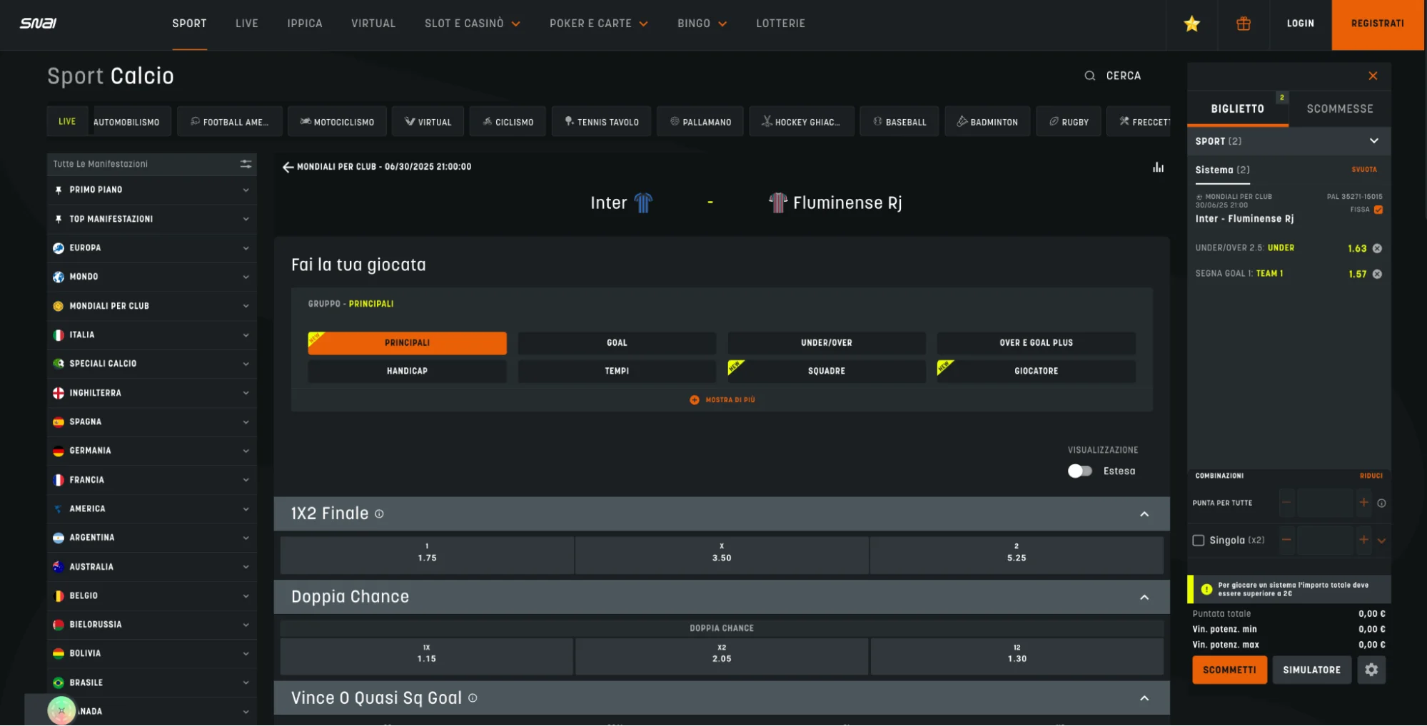 SNAI offre diverse tipologie di scommesse: singole, multiple e sistemi. Aggiungere più selezioni alla schedina è semplice: basta cliccare sulle quote desiderate e queste verranno raccolte automaticamente nel ticket, visibile sul lato destro dello schermo. Da lì puoi scegliere se giocare in modalità singola, multipla o sistema.