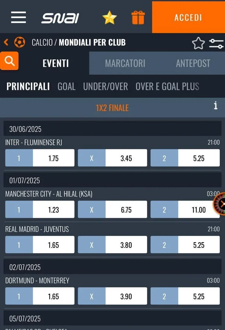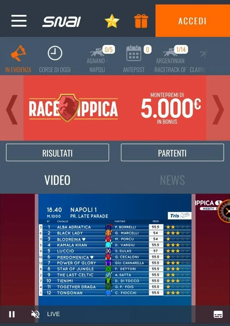 Per quanto riguarda lo sport più seguito in Italia, ovvero il calcio, l’offerta include non solo la Serie A e i principali campionati europei, ma anche numerose leghe latinoamericane e africane. Su SNAI trovi inoltre mercati sugli eSports, manifestazioni speciali, e sull’ippica – considerata il fiore all’occhiello dell’operatore – e persino scommesse sui migliori marcatori del calcio mondiale.