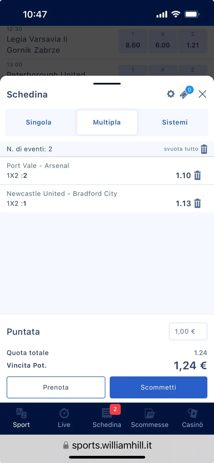 Piazzare una scommessa su William Hill è davvero intuitivo. Una volta scelto lo sport e la competizione che ti interessa, avrai a disposizione la lista completa delle partite con le rispettive quote. Basta un click sulla quota che preferisci per vederla apparire automaticamente nella tua schedina alla destra dello schermo. Puoi decidere se giocare una singola, combinare più eventi in multipla oppure costruire un sistema.