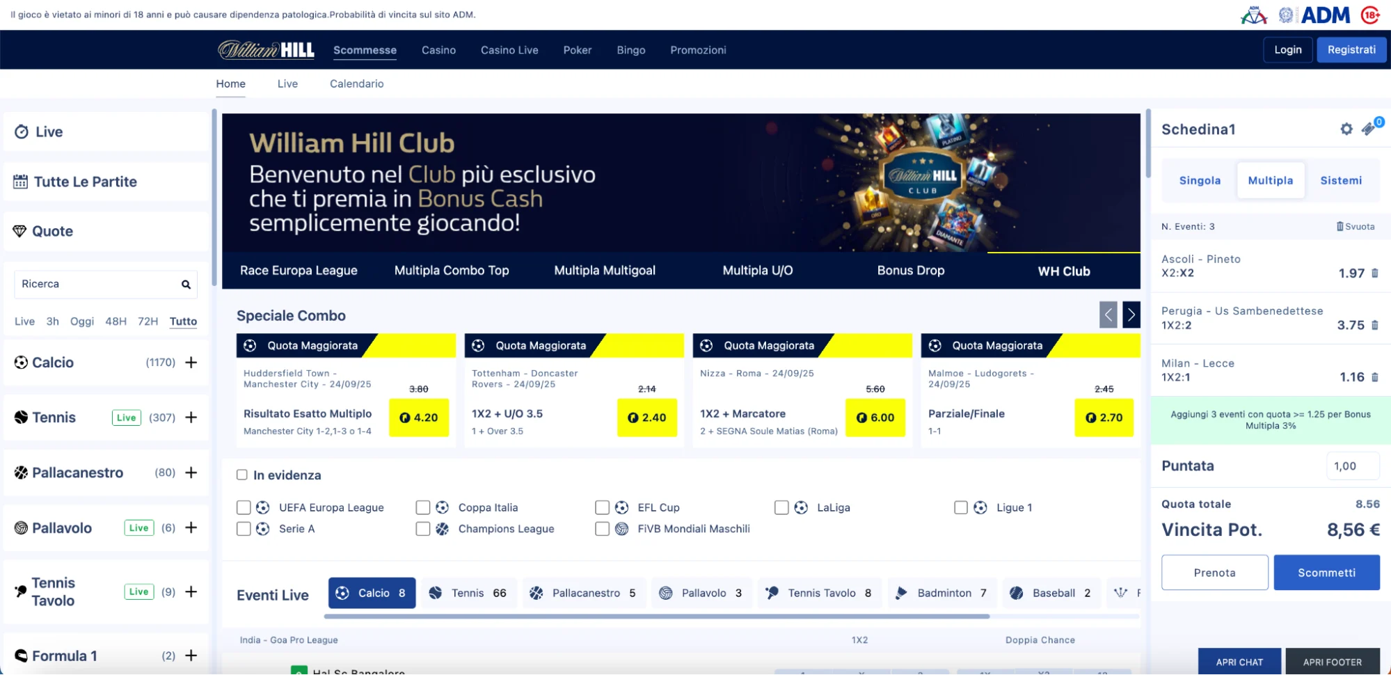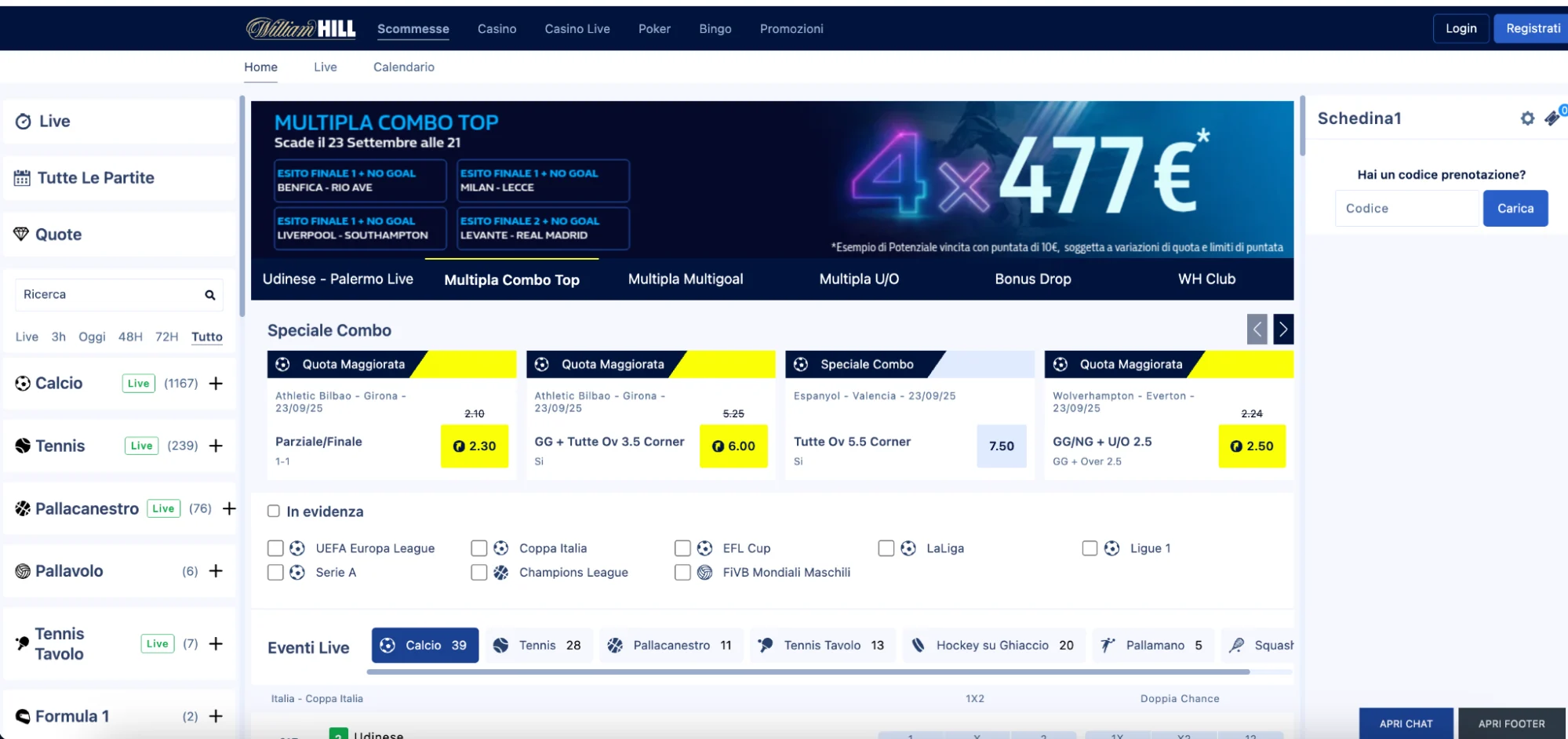 Nella parte centrale della pagina sono in evidenza le partite più attese o quelle imminenti, mentre la colonna di sinistra è riservata all’elenco completo degli sport e delle competizioni. A destra trovi infine la schedina per l’inserimento delle tue giocate.